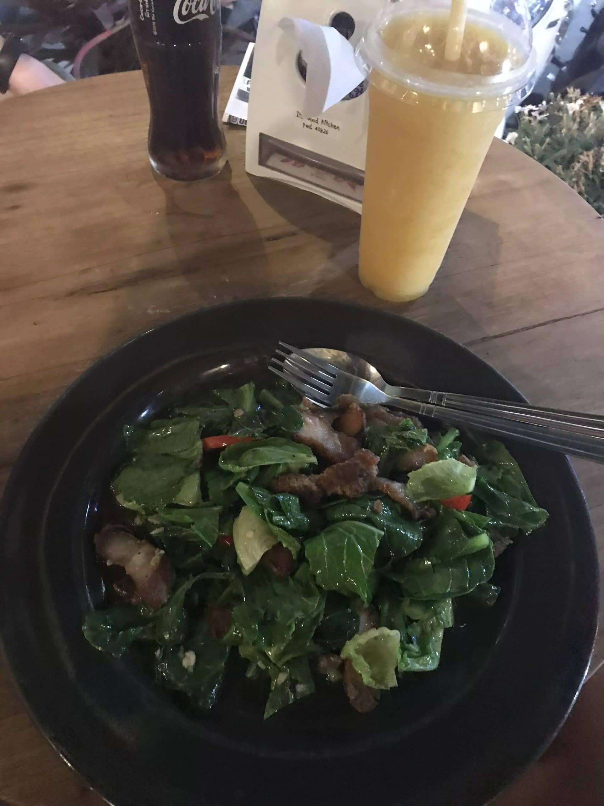 Ich bestellte mir mein lieb gewonnenes Crispy Pork mit Grünkohl. Im Grunde handelt es sich einfach um knusprig frittierten Schweinebauch der mit Grünkohl, Knoblauch, Chilli und anderen Gewürzen aus dem Wok kommt. Ich hoffe jetzt schon das ich etwas vergleichbares in Laos finde.