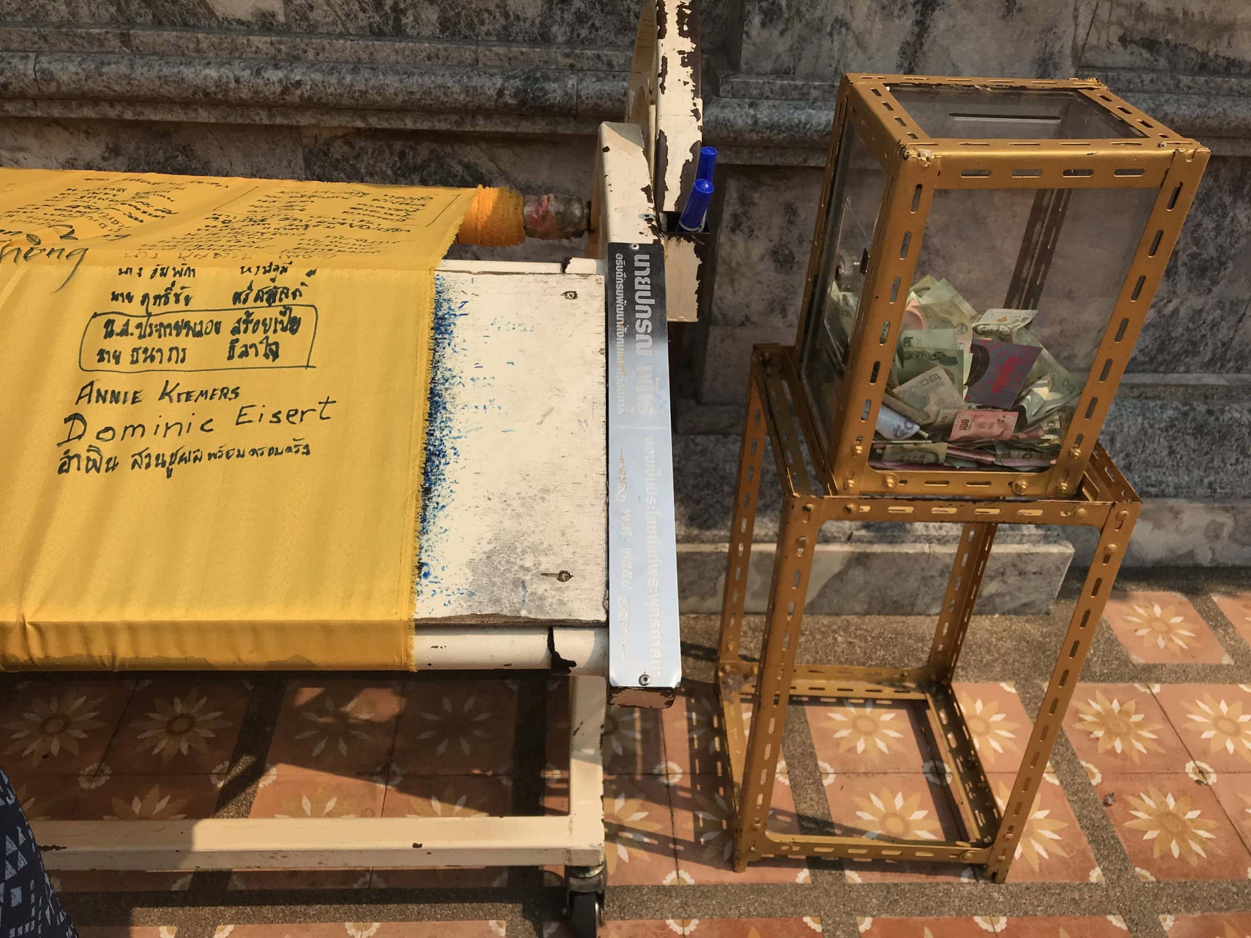 Wir schauten uns den wirklich schönen Tempel an und spendeten für den Erhalt ein paar Baht, als Gegenleistung durften wir auf einem Transparent unterschreiben das später komplett um das Chedi (Glockenartige Kuppel im Zentrum des Tempel) gewickelt wird wenn es voll ist.