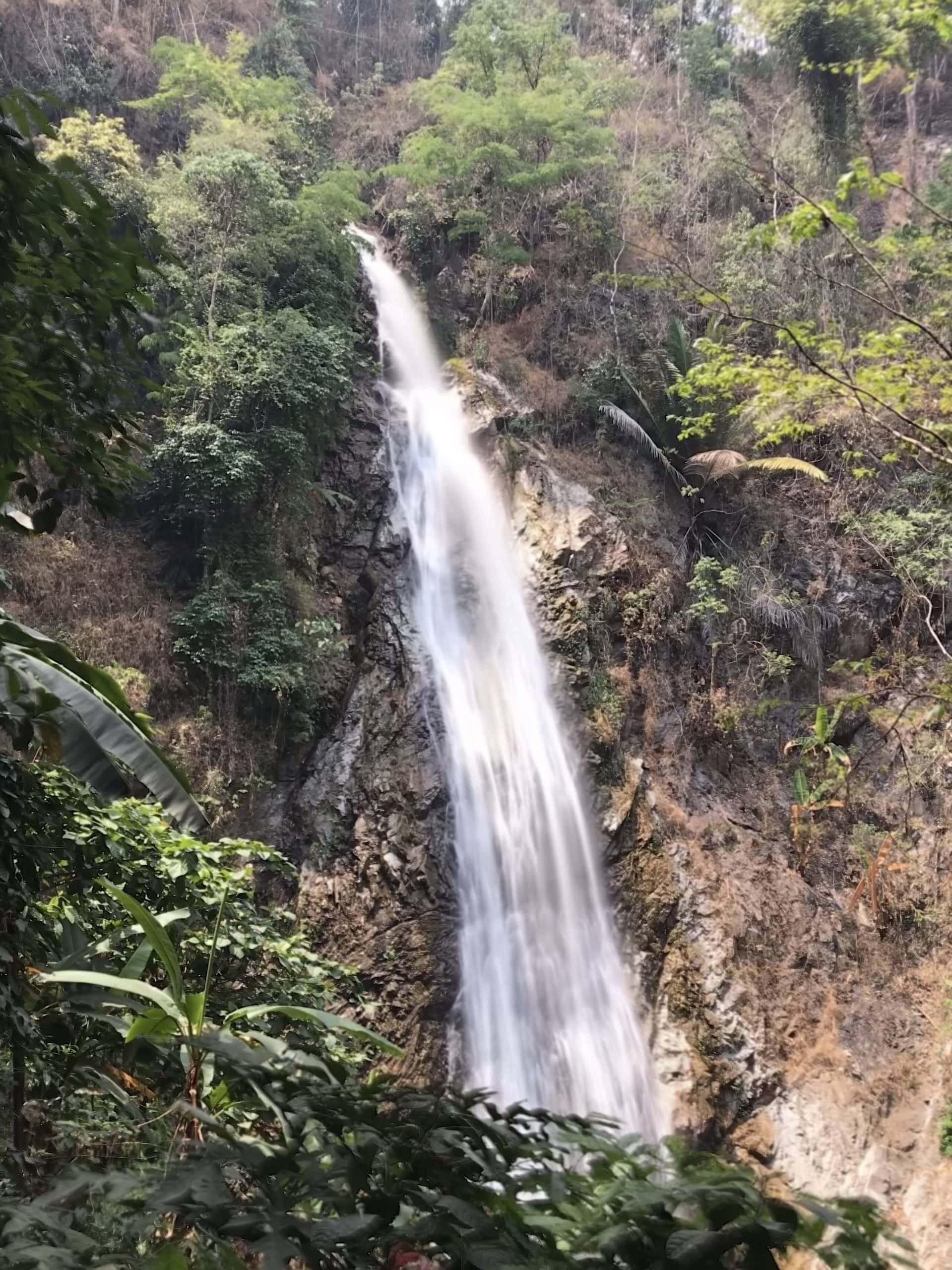 Die zweite Station an diesem Tag war der Wasserfall Khun Korn im gleichnamigen Nationalpark. Wir parkten den Roller auf dem Parkplatz des Parks und machten uns auf zum 1,6 km entfernten Wasserfall, quer durch den Dschungel, mal wieder auf einem Trampelpfad mit viel Steigung. Angekommen und erschöpft von der Wärme, die durch den Dschungel und seine hohe Luftfeuchtigkeit noch gesteigert wird, hatten wir einen wundervollen Blick auf den Wasserfall.