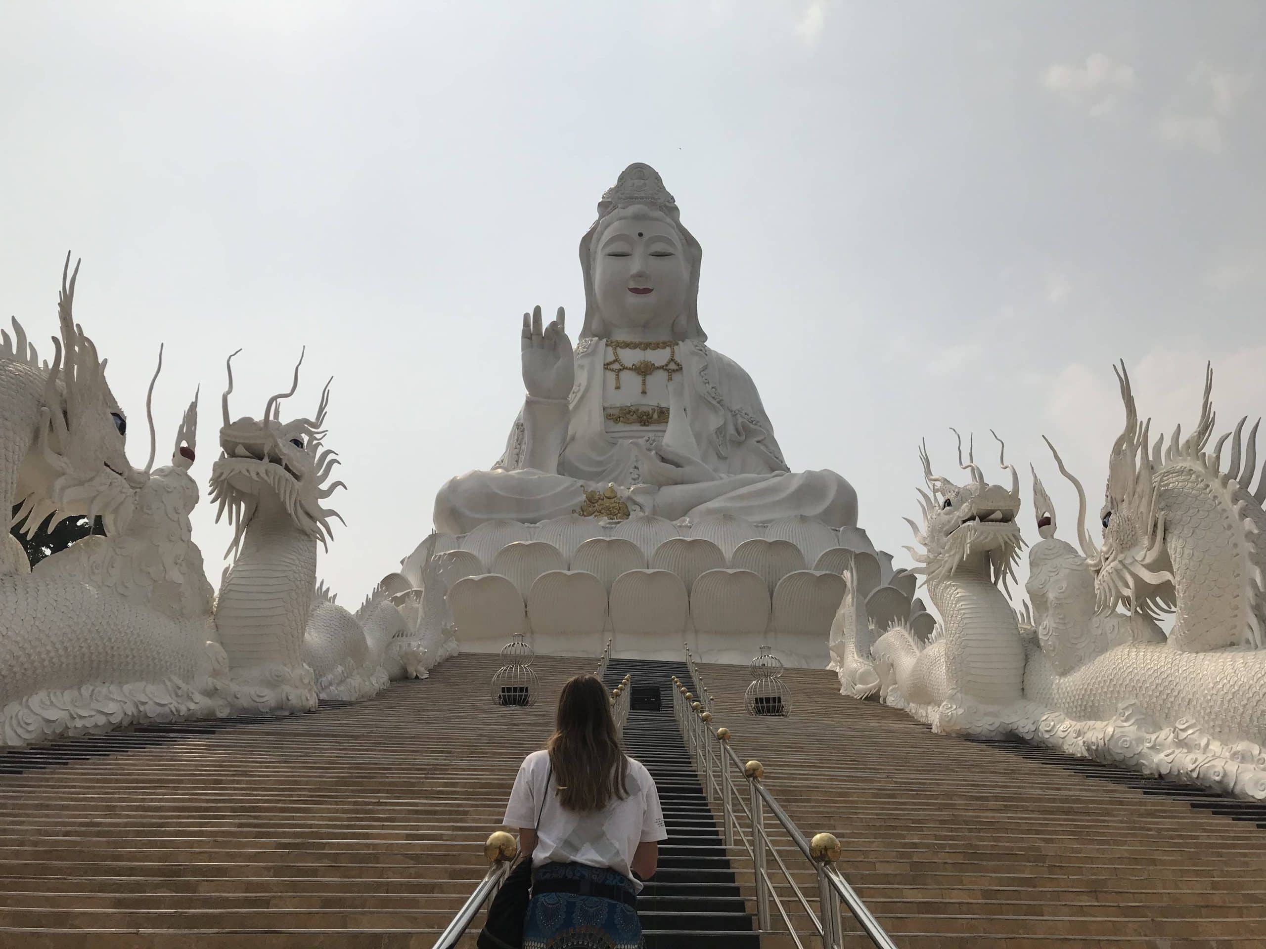Zum Abschluss des Tages besuchten wir noch einen chinesischen Tempel, unser Gastgeber gab uns auch hier den Tipp, es wäre der einzige Tempel mit einem weiblichen Buddha in Thailand, nur er sagte uns nicht um was für einen Buddha es sich handeln würde. Kurz bevor wir angekommen sind, ahnten wir langsam was auf uns zukommen würde, wir sahen den Buddha bereits aus einiger Entfernung und er wurde immer größer desto näher wir kamen. Ungläubig standen wir am Ende vor einer Statue die nicht weniger als 100 Meter hoch war, am Fuße der Statue zwei kleinere Tempel und eine lange Treppe die mit riesigen Drachen gesäumt war.